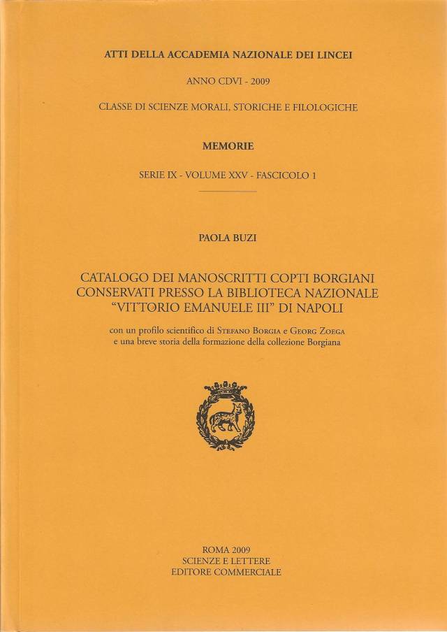 The article is a review of P. Buzi, Catalogo dei manoscritti copti borgiani conservati presso la Biblioteca Nazionale “Vittorio Emanuele III” di Napoli (Accademia dei Lincei – Memorie, Ser. IX, 25/1; Rome 2009).