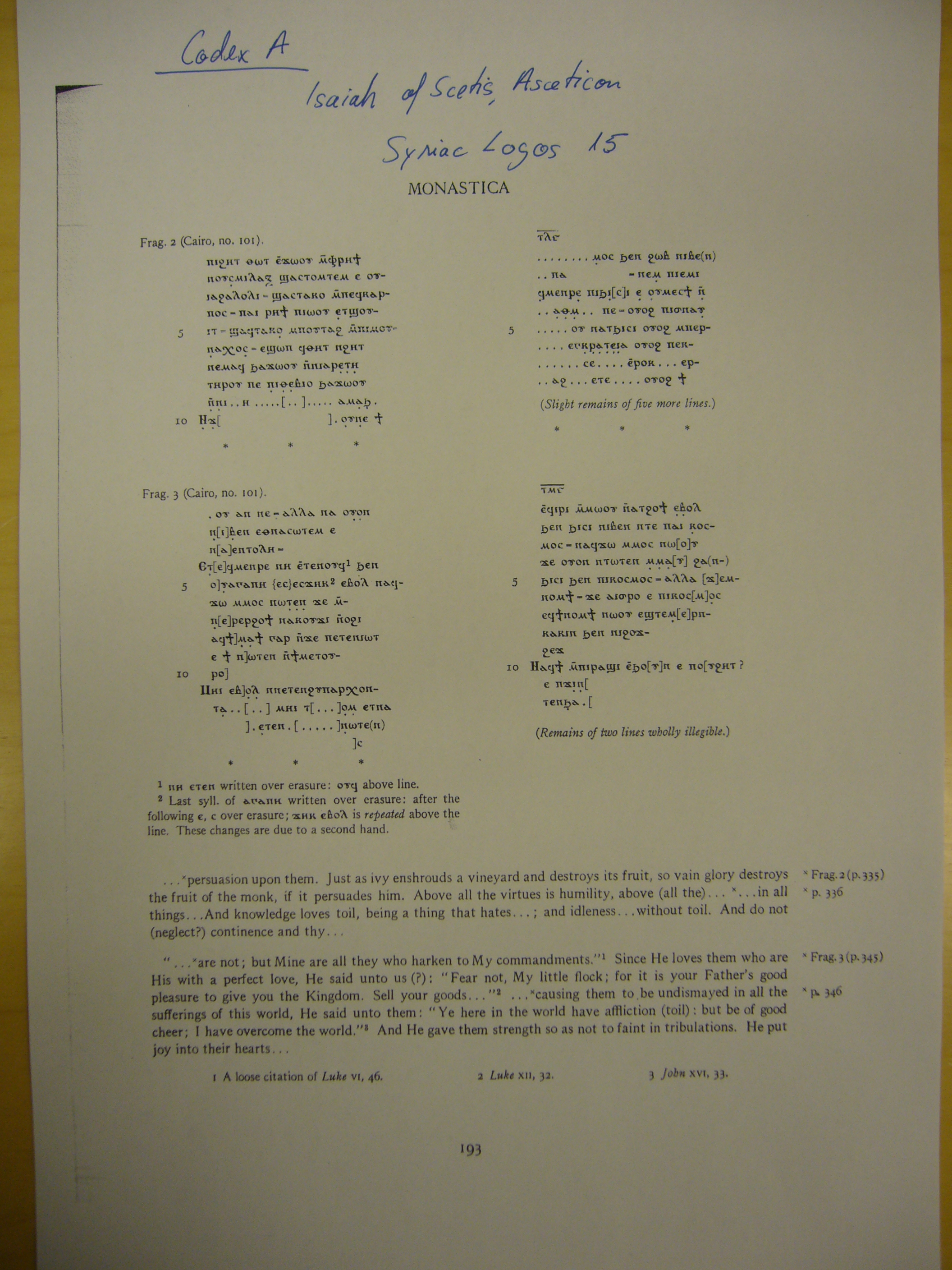 [8] Preliminary codicological study of the fragments in A. Guillaumont, “La recension copte de l’Ascéticon de l’Abbé Isaïe,” in Coptic Studies in Honor of Walter Ewing Crum (Boston 1950) 49-60. The fragments were edited in A. Guillaumont, L’Asceticon copte de l’abbé Isaïe. Fragments sahidiques édités et traduits (Bibliothèque d’études coptes, 5; Cairo 1956). Additional Coptic fragments in E. Lucchesi, “Le dossier d’Apa Zénobe. Addenda et corrigenda. Appendice II: Un Logos inconnu d’Isaïe de Scété. Chenouté, Isaïe et Moïse,” Analecta Bollandiana 117 (1999) 67-80, at 77; A. Suciu, “The Borgian Coptic Manuscripts in Naples: Supplementary Identifications and Notes to a Recently Published Catalogue,” forthcoming in Orientalia Christiana Periodica 77 (2011).