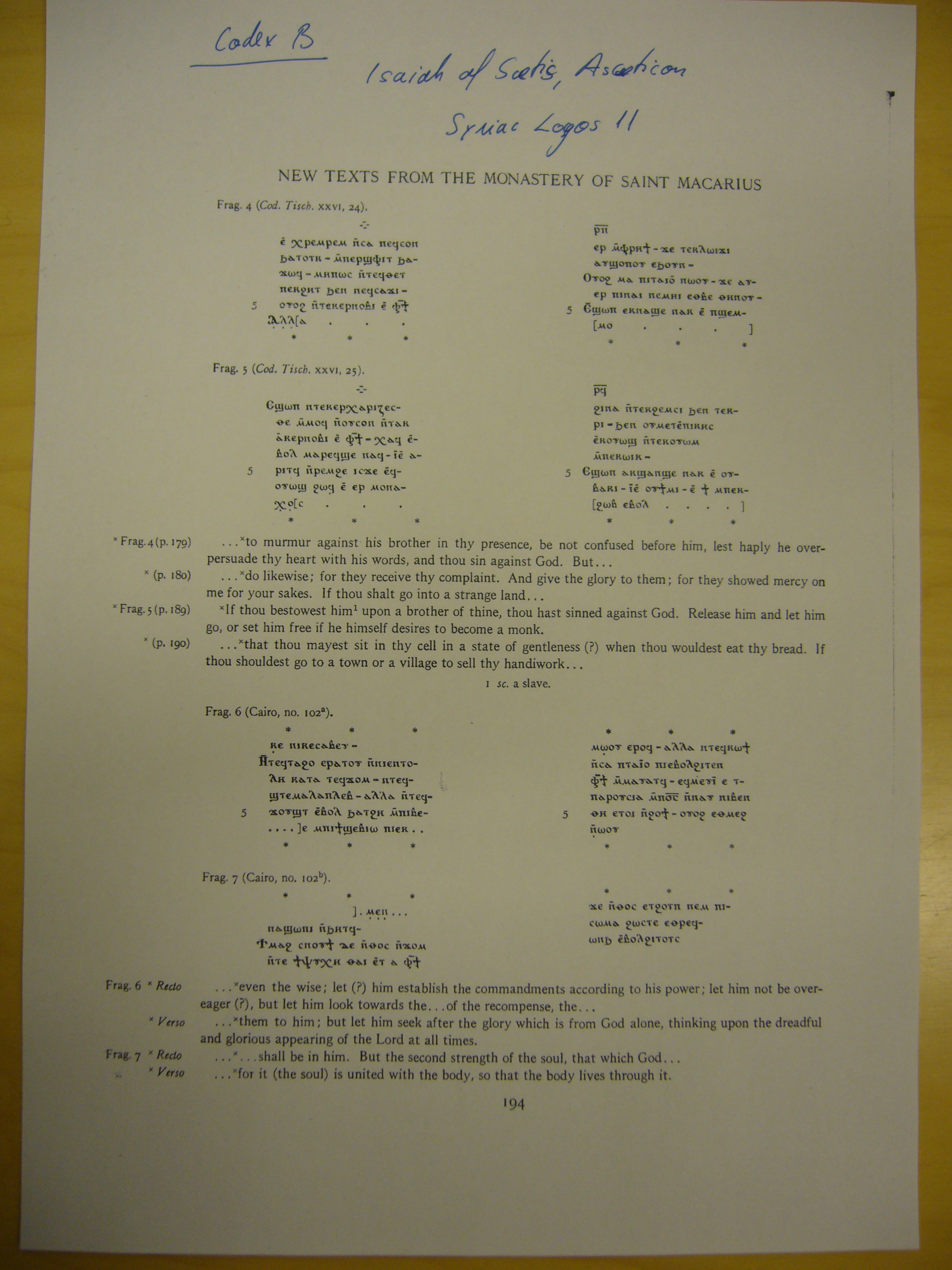 I should like to mention here that, although not yet identified, several such Bohairic fragments of the Asceticon were published already in 1926 by Hugh G. Evelyn White in his Monasteries of the Wadi ’N Natrun.[17] Thus, four out of seven parchment fragments edited by Evelyn White under the heading “Monastica,” belong precisely to the Logoi of Abba Isaiah. Their original provenance is the Monastery of St. Macarius in Wadi ’N Natrun, our main source of early Bohairic manuscripts.