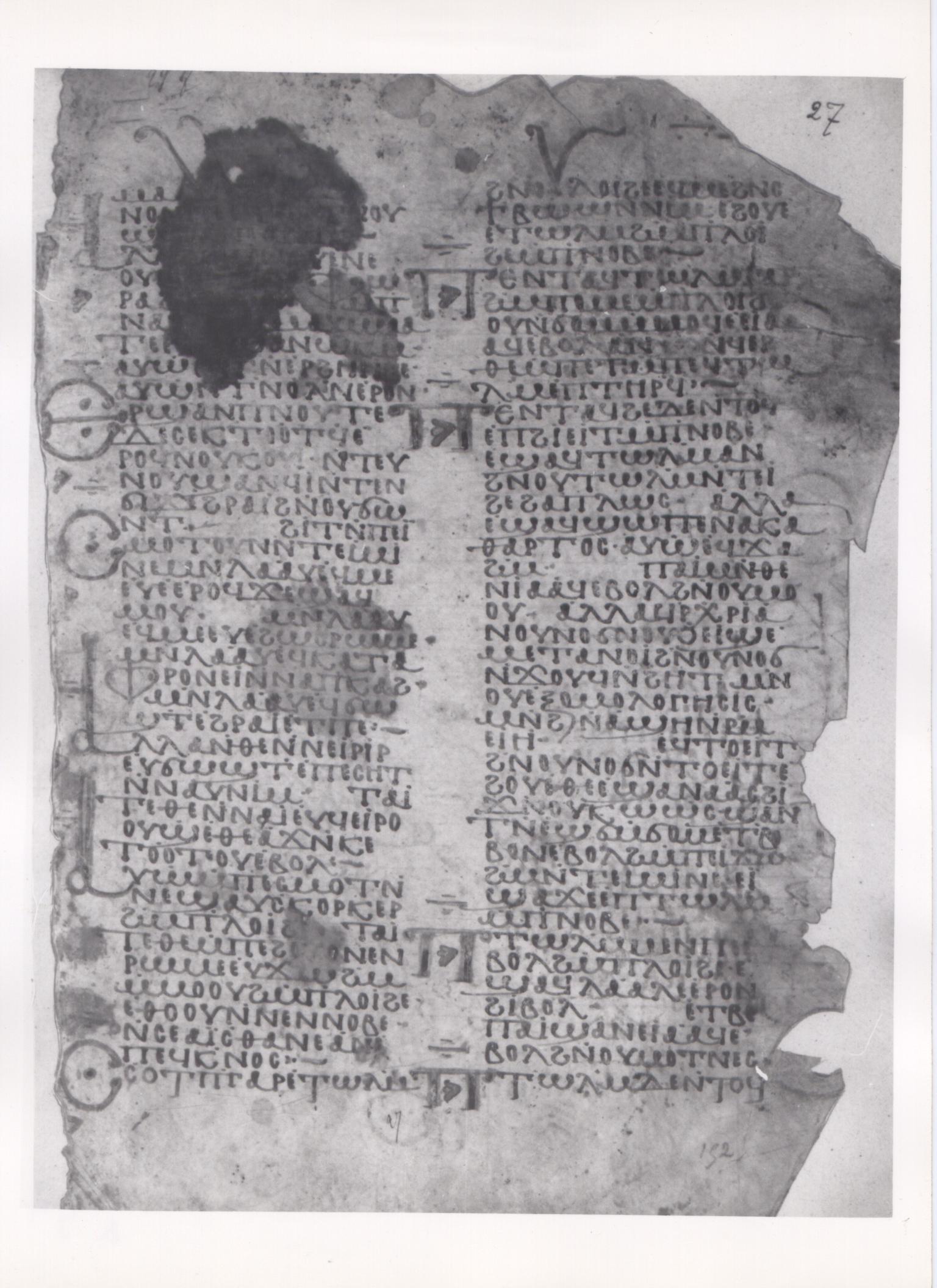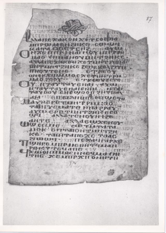 In 1909, in his catalogue of the Coptic manuscripts in John Rylands Library in Manchester, Walter Ewing Crum showed that this collection possesses a palimpsest parchment leaf which contains part of a homily on the Epistle to the Hebrews by John Chrysostom.[2] This is MS 25, fol. 4 and the original manuscript, today dismembered, came from the Monastery of Apa Shenoute, or the White Monastery, in Upper Egypt.