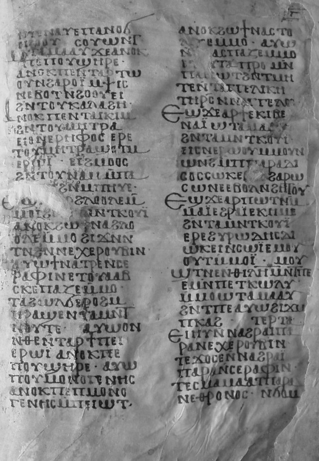 There is just one thing which I have to add to Hans’ edition of the Paris fragments – namely that the text has been already identified by Enzo Lucchesi as belonging to a homily on the Dormition of Mary attributed to Evodius of Rome (CANT 133; clavis coptica 0151).[3] I have already spoken previosuly on this blog about this fictional character. A “short” version of the homily on the Dormition of the Virgin attributed to Evodius was translated by Stephen Shoemaker in Analecta Bollandiana,[4] but the Paris fragments do not parallel it. The reason is that they seem to belong to a different “long” version of the text, which is still unpublished, but which can be recovered from various fragments of Coptic manuscripts, also still mostly unpublished.[5] A full directory of the Coptic (Sahidic and Bohairic) fragments of pseudo-Evodius sermon on the Dormition still has to be made.