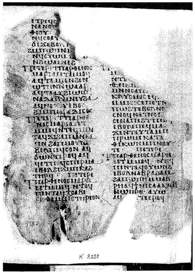 Moreover, it seems that another fragment from Vienna, i.e. K 9220, belonged in its turn to the same writing and manuscript. Unfortunately, the third piece is damaged in the upper part so that the pagination did not survive. It is thus impossible to say whether it preceded the previous two fragments, or whether it came after them.