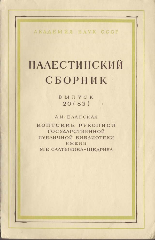 Ivan Miroshnikov, my colleague from Helsinki, sent me a PDF version of A.I. Elanskaya, Коптские рукописи Госупарственной библиотеки имени М.Е. Салтыкова-Щедрина (= Coptic Manuscripts of the M.E. Saltykov-Schedrin State Public Library) Palestinskij Sbornik 20 (1969). Now, I must admit I am quite enthusiastic of having this rare gem so I thought I must share it.