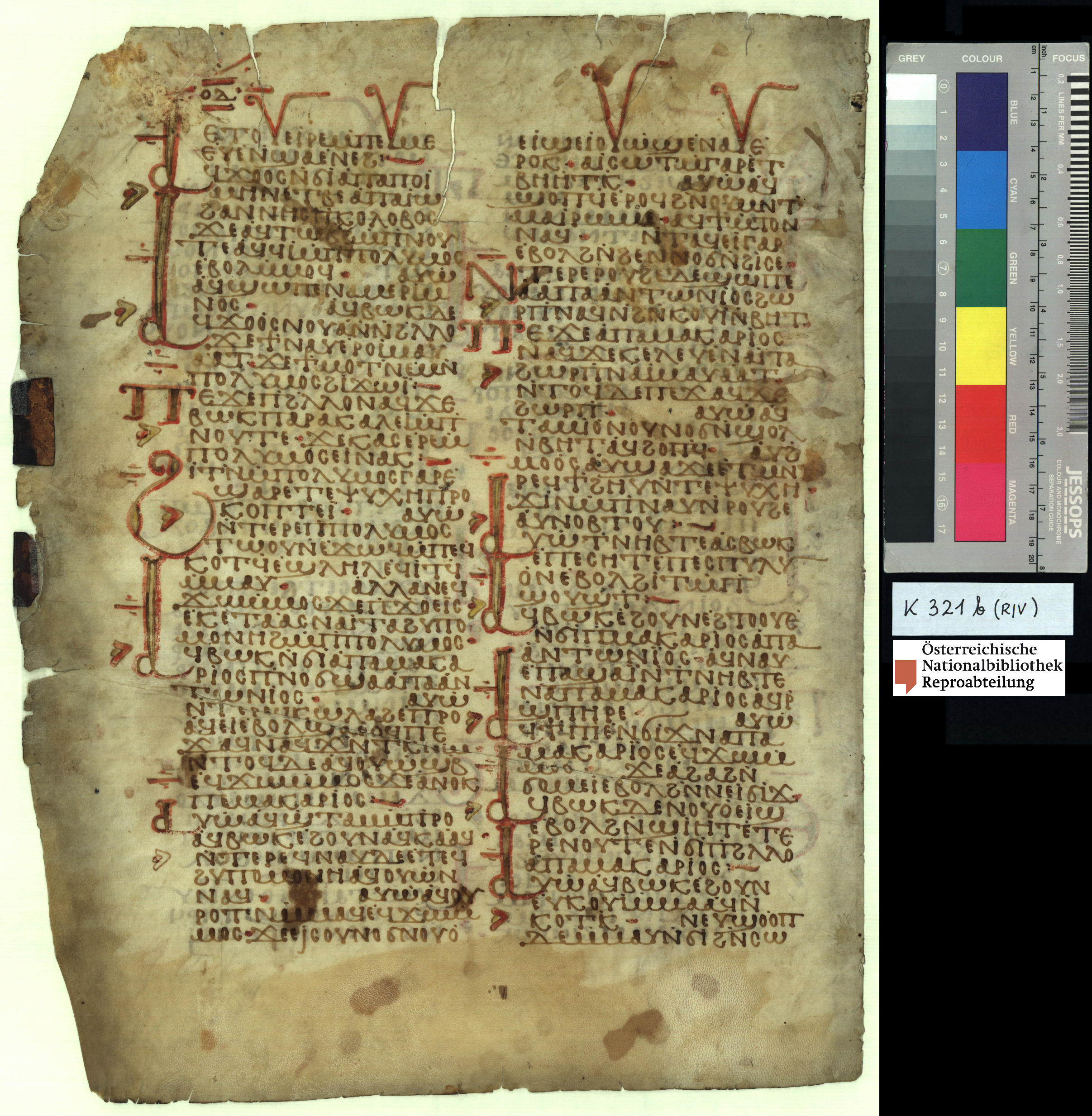 Vienna, Österreichische Nationalbibliothek, MS K321b verso. Parchment leaf with the text of the Apophthegmata Patrum in the Sahidic dialect of Coptic (the photo was taken from the website of the Austrian National Library).