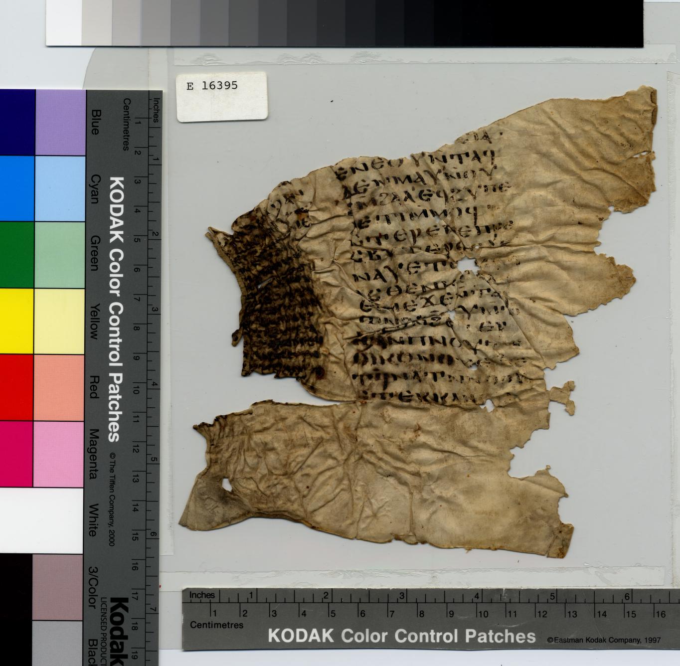 I shall start with fragment E 16395. This is a parchment fragment from a two-column codex elegantly written in uncial letters. The left hand column of the recto and the right hand one on the verso are wrinkled, those portions being very difficult to decipher solely on the basis of the photographic reproductions.
