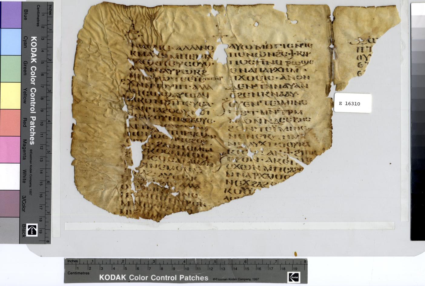 The Pennsylvania fragment E 16310 is the first attestation of the 16th Oration of Gregory the Theologian in Coptic. The incipit “For when I hear Isaiah reprimanding the people of Sodom and rulers of Gomorrah: ‘Why should you be smitten anymore, adding to your transgression?,’ I am filled with fear and tremble…,” parallels the Greek Ἡσαΐου μὲν γὰρ ὅταν ἀκούσω, τῷ λαῷ Σοδόμων καὶ τοῖς ἄρχουσι Γομόῤῥας ἀπειλοῦντος, καὶ λέγοντος· Τί ἔτι πληγῆτε, προστιθέντες ἀνομίαν; μικροῦ καὶ φρίκης πληροῦμαι. The Pennsylvania fragment ends with the words “you brought upon us the ancient curse: throw much and bring little,” which is a variant reading for the Greek ὡς ἡ παλαιὰ κατάρα, πλείονα, καὶ εἰσενεγκεῖν ὀλίγα (PG vol. 35, col. 956-957).