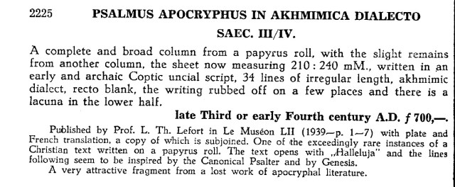 It is likely, therefore, that the papyrus sheet edited by Lefort was sold by Erik von Scherling to Lawrence Feinberg. As the latter died some years ago, now the time has come for the manuscript to again change ownership. Unfortunately, I am a bit skeptical that the document will be purchased by an institution, who would preserve it properly for further research. Rather, I am inclined to think that it will end up in a private collection. In this case, we shall perhaps lose track of it again at least for the next decades, if not forever.